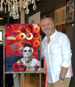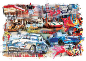 Mélangeant déchirures et couleurs éclatantes, il met dans son mixeur des images de légendes cinématographiques, de robots, de voitures, de souvenirs, de symboles pour créer sa propre vision graphique et peut-être la vôtre …