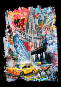 Mélangeant déchirures et couleurs éclatantes, il met dans son mixeur des images de légendes cinématographiques, de robots, de voitures, de souvenirs, de symboles pour créer sa propre vision graphique et peut-être la vôtre …